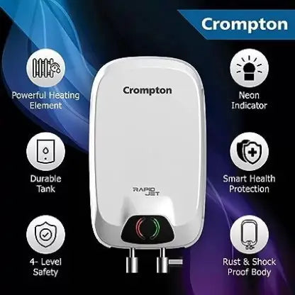 Powerful Heating Element: The 3000/4500-watt high quality copper heating element material ensures fast heating of water and provides the perfect hot water anytime of the day. The Rapidjet is suitable for use in high rise buildings and can withstand pressure up to 8.0 kg/cm2. Your Rapidjet comes with a durable body that offers toughness and heat resistance. Crompton Instant Water Heaters come with Capillary Thermostat, automatic Thermal Cut-Off, a Pressure Release Valve and a fusible plug to give 4 layers of safety.