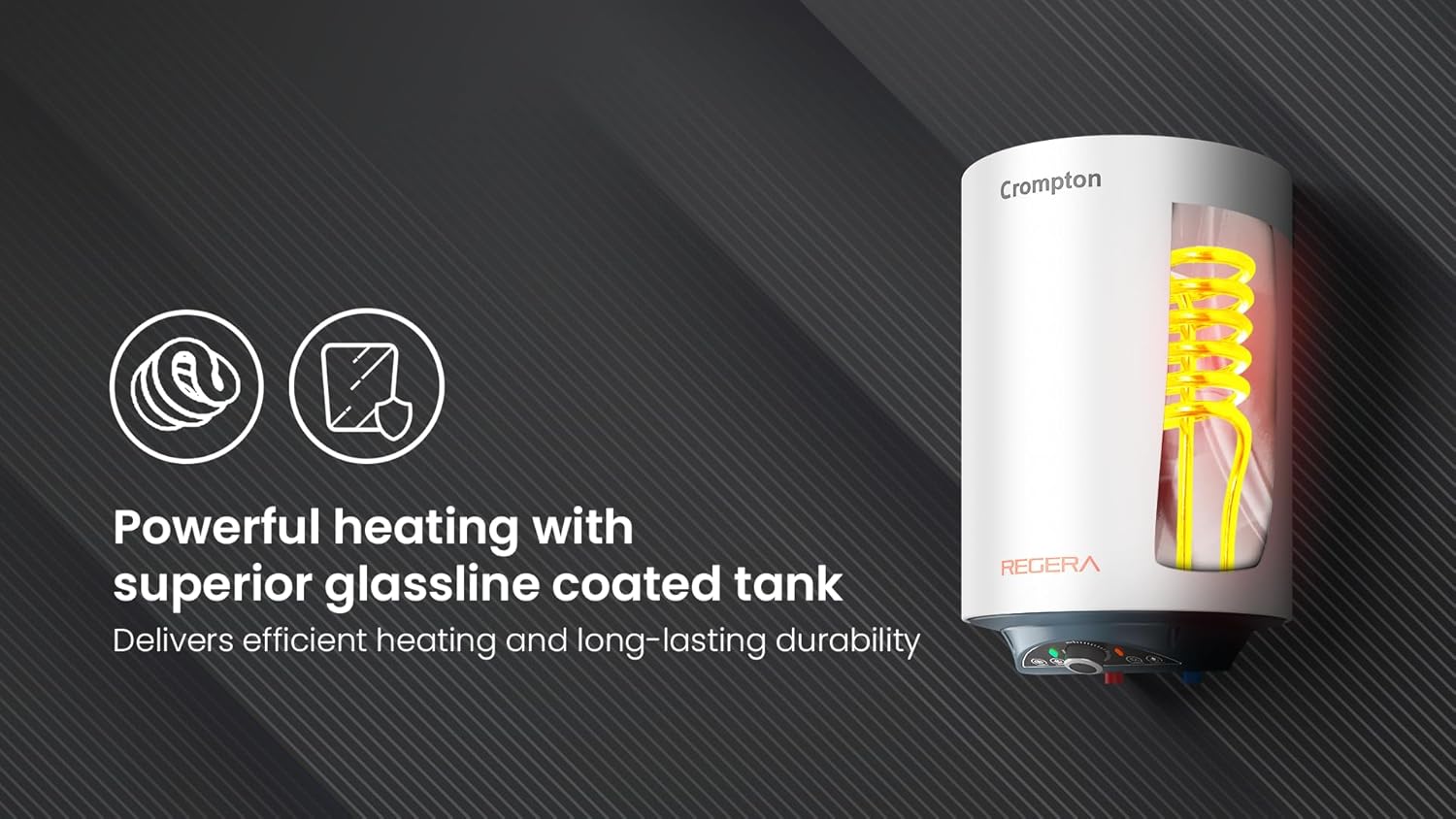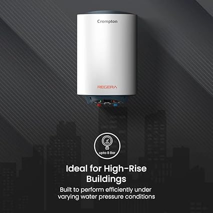 The Crompton Regera 25L Storage Water Heater (ASWH-3825) is designed to deliver powerful performance, long-lasting durability, and maximum comfort. Featuring a robust 2000W heating element and a glassline-coated tank, it ensures fast heating while resisting corrosion and scaling for extended life. With a large 25-liter capacity, it is perfect for medium to large families, offering ample hot water for showers, baths, and daily household chores. The heater comes with a rustproof metal body and Smart Shield protection for added reliability. Its 3-level advanced safety system prevents overheating, pressure build-up, and electrical hazards, ensuring a worry-free experience. Built to handle up to 8 Bar water pressure, it is suitable even for high-rise apartments. Stylish, durable, and safe, the Crompton Regera 25L is the ideal hot water solution for your home.